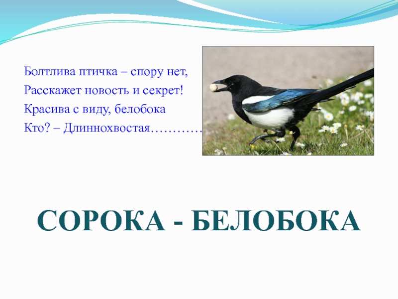 У сороки есть прозвище - белобока. По бокам перышки у неё белые, а