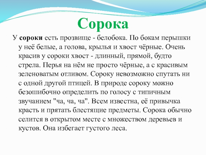 голова, крылья и хвост чёрные. Очень красив у сороки хвост - длинный, прямой, будто стрела. Перья на нём не просто чёрные, а с красивым зеленоватым отливом. Сороку невозможно спутать ни с одной другой птицей. В природе сороку можно безошибочно определить по голосу с типичным звучанием "ча, ча, ча". Всем известна, её привычка красть и прятать блестящие предметы. Сорока обычно селится в открытом месте с множеством деревьев и кустов. Она избегает густого леса.