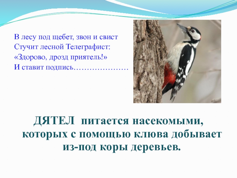 ДЯТЕЛ питается насекомыми, которых с помощью клюва добывает из-под коры деревьев.