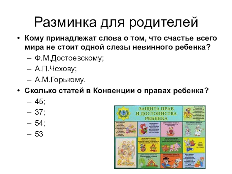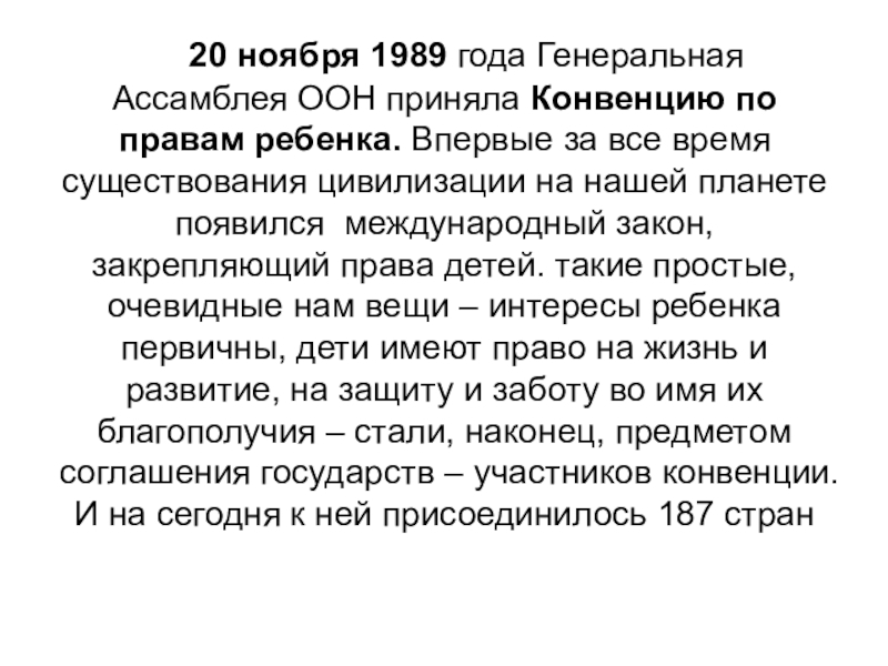 по правам ребенка. Впервые за все время существования цивилизации на нашей планете появился международный закон, закрепляющий права детей. такие простые, очевидные нам вещи – интересы ребенка первичны, дети имеют право на жизнь и развитие, на защиту и заботу во имя их благополучия – стали, наконец, предметом соглашения государств – участников конвенции. И на сегодня к ней присоединилось 187 стран