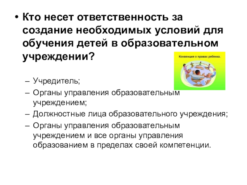Слайд 7Кто несет ответственность за создание необходимых условий для обучения детей в