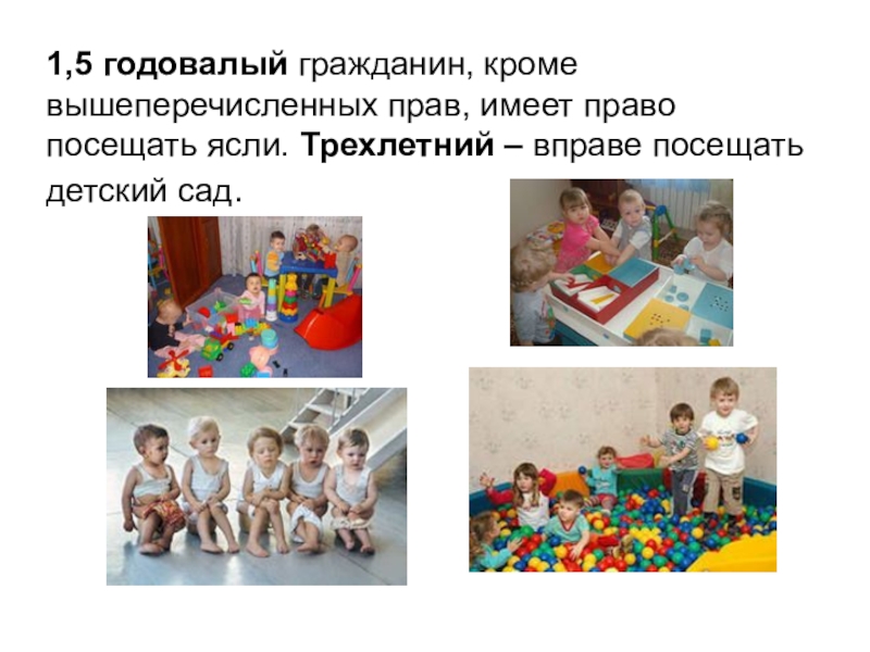 Слайд 91,5 годовалый гражданин, кроме вышеперечисленных прав, имеет право посещать ясли. Трехлетний