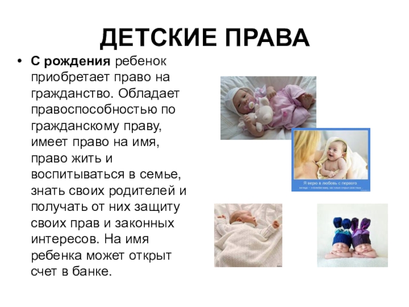 гражданскому праву, имеет право на имя, право жить и воспитываться в семье, знать своих родителей и получать от них защиту своих прав и законных интересов. На имя ребенка может открыт счет в банке.