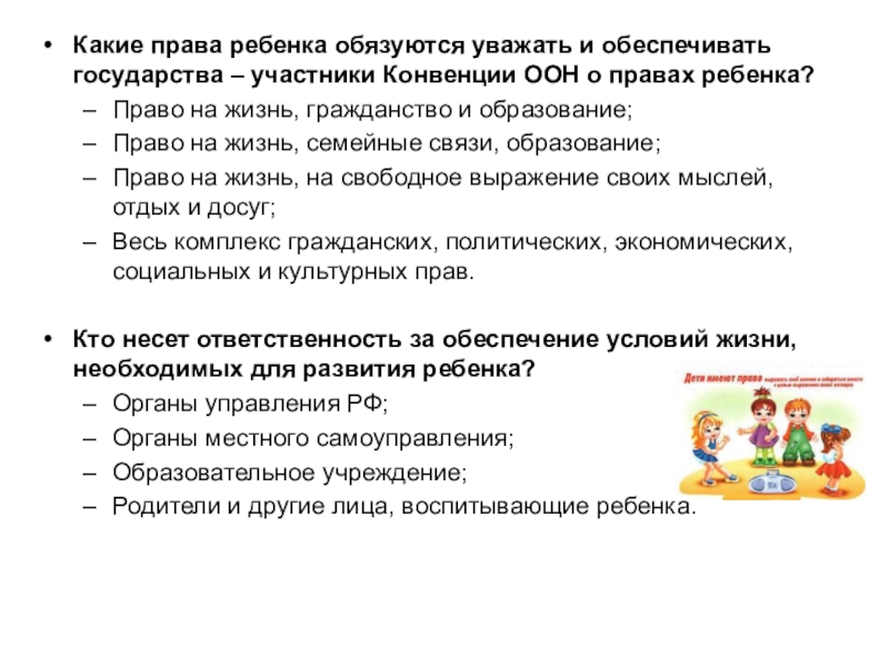 Слайд 5Какие права ребенка обязуются уважать и обеспечивать государства – участники Конвенции