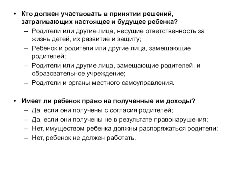 Слайд 6Кто должен участвовать в принятии решений, затрагивающих настоящее и будущее ребенка?