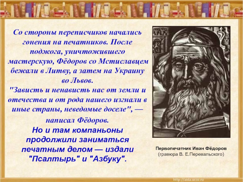 Первопечатник Иван Фёдоров (гравюра В. Е.Перевальского)