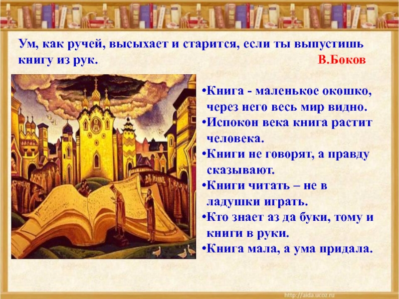 Ум, как ручей, высыхает и старится, если ты выпустишь книгу из рук. В.Боков