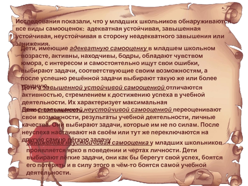 Дети, имеющие адекватную самооценку в младшем школьном возрасте, активны, находчивы, бодры, обладают чувством юмора, с интересом и самостоятельно ищут свои ошибки, выбирают задачи, соответствующие своим возможностям, а после успешно решённой задачи выбирают такую же или более трудную.