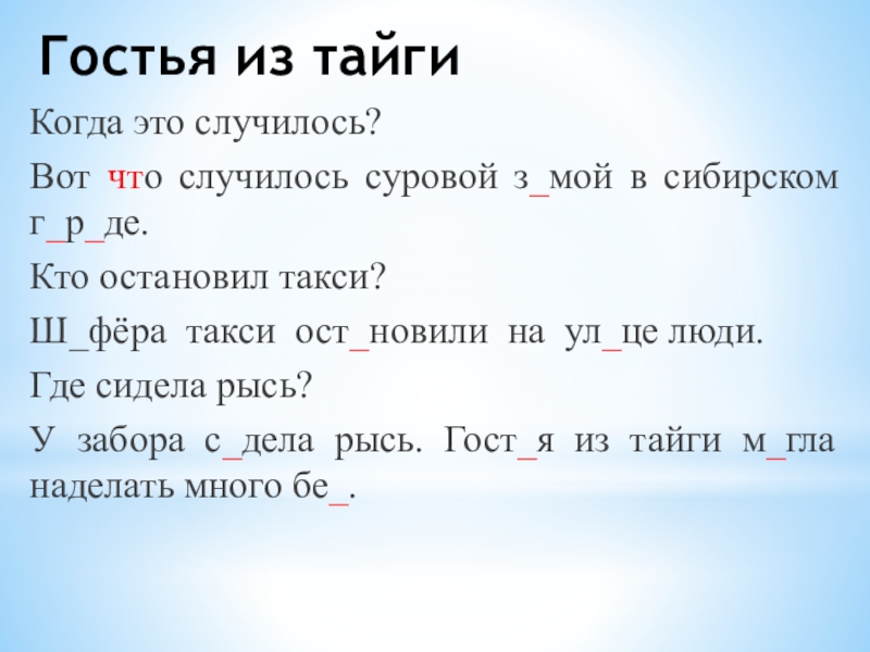 Гостья из тайгиКогда это случилось?Вот что случилось суровой з_мой в сибирском г_р_де. Кто остановил такси? Ш_фёра такси