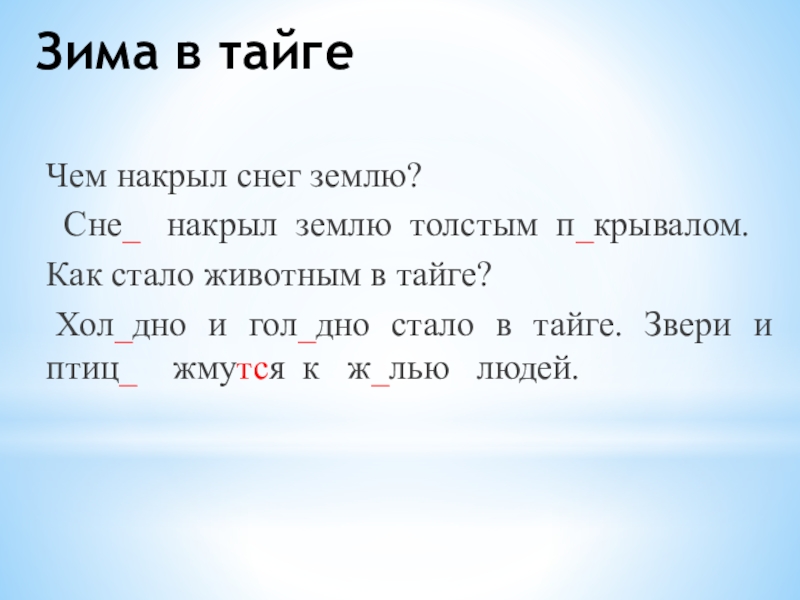 Зима в тайгеЧем накрыл снег землю? Сне_  накрыл землю толстым п_крывалом.Как стало животным в тайге? Хол_дно