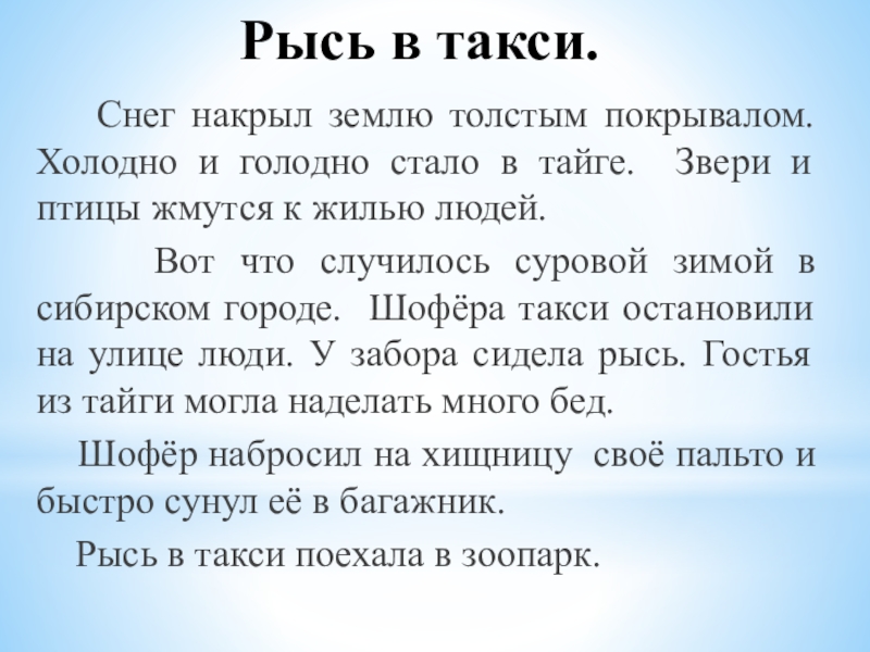 ПланЗима в тайге.Гостья из тайги.Поступок шофёра.Рысь в такси.