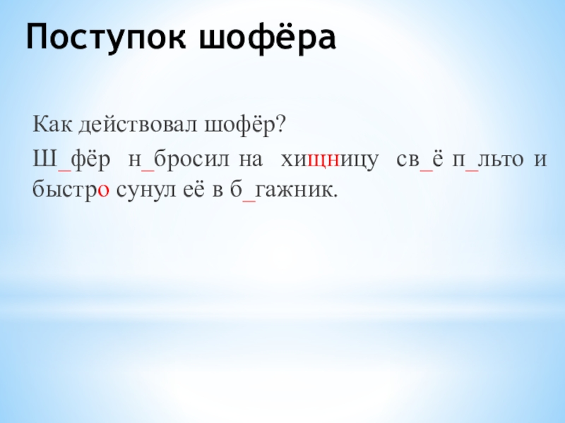 Поступок шофёраКак действовал шофёр?Ш_фёр н_бросил на хищницу св_ё п_льто и быстро сунул её в б_гажник.
