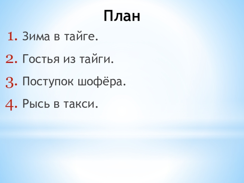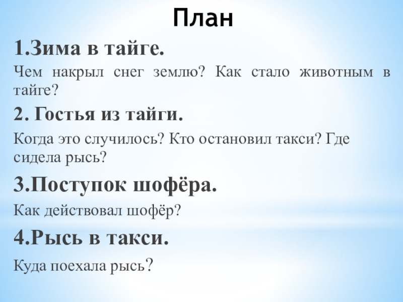 План1.Зима в тайге. Чем накрыл снег землю? Как стало животным в тайге?2. Гостья из тайги. Когда это