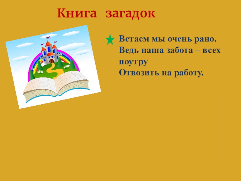 Книга  загадокВстаем мы очень рано.Ведь наша забота – всех поутруОтвозить на работу.