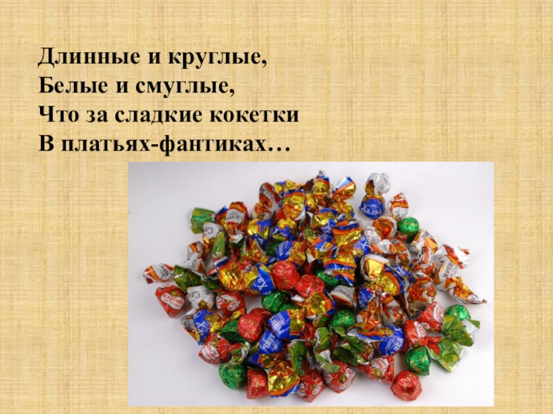 Длинные и круглые,Белые и смуглые,Что за сладкие кокеткиВ платьях-фантиках…