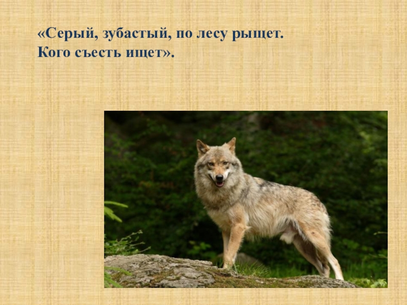 Слайд 3«Серый, зубастый, по лесу рыщет. Кого съесть ищет».