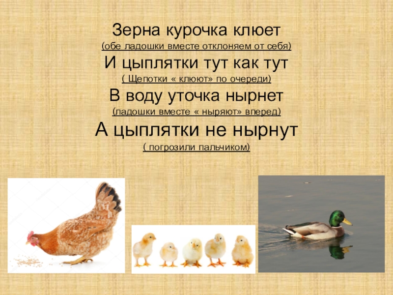 (обе ладошки вместе отклоняем от себя) И цыплятки тут как тут ( Щепотки « клюют» по очереди) В воду уточка нырнет (ладошки вместе « ныряют» вперед) А цыплятки не нырнут ( погрозили пальчиком)