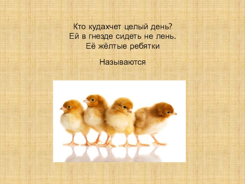 Слайд 3Кто кудахчет целый день? Ей в гнезде сидеть не лень. Её жёлтые ребятки Называются