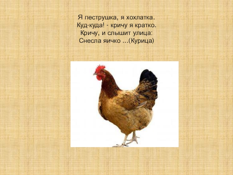 Слайд 2Я пеструшка, я хохлатка. Куд-куда! - кричу я кратко. Кричу, и слышит улица: Снесла