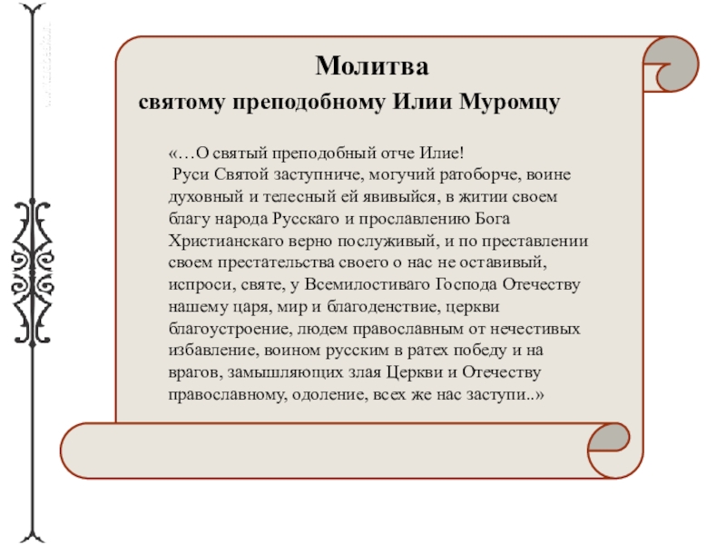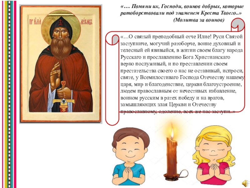 «…О святый преподобный отче Илие! Руси Святой заступниче, могучий ратоборче, воине духовный и телесный ей явивыйся, в житии своем благу народа Русскаго и прославлению Бога Христианскаго верно послуживый, и по преставлении своем престательства своего о нас не оставивый, испроси, святе, у Всемилостиваго Господа Отечеству нашему царя, мир и благоденствие, церкви благоустроение, людем православным от нечестивых избавление, воином русским в ратех победу и на врагов, замышляющих злая Церкви и Отечеству православному, одоление, всех же нас заступи..»