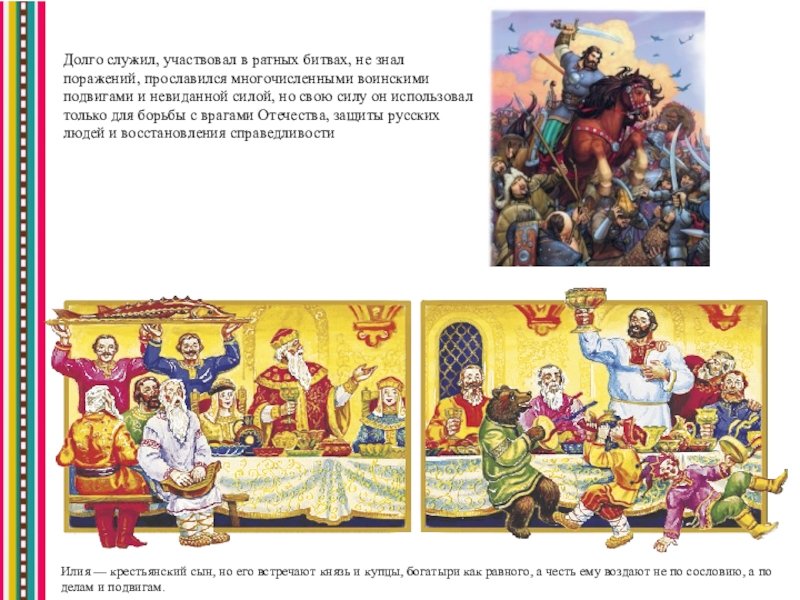Долго служил, участвовал в ратных битвах, не знал поражений, прославился многочисленными воинскими подвигами и невиданной силой, но свою силу он использовал только для борьбы с врагами Отечества, защиты русских людей и восстановления справедливости