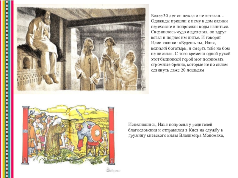 Исцелившись, Илья попросил у родителей благословения и отправился в Киев на службу в дружину киевского князя Владимира Мономаха,
