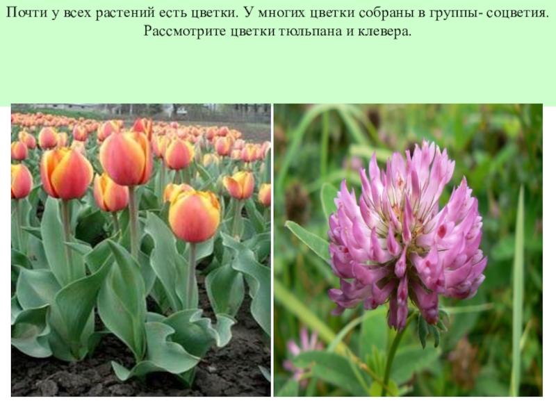группы- соцветия. Рассмотрите цветки тюльпана и клевера.