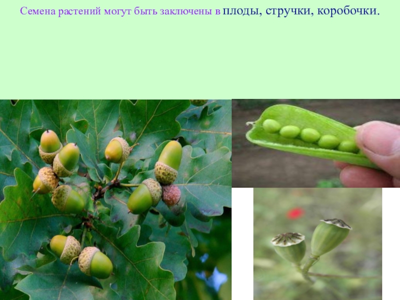 Слайд 6Семена растений могут быть заключены в плоды, стручки, коробочки.