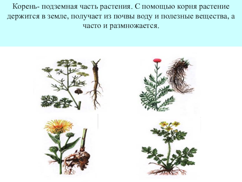Корень- подземная часть растения. С помощью корня растение держится в земле, получает из почвы воду и полезные