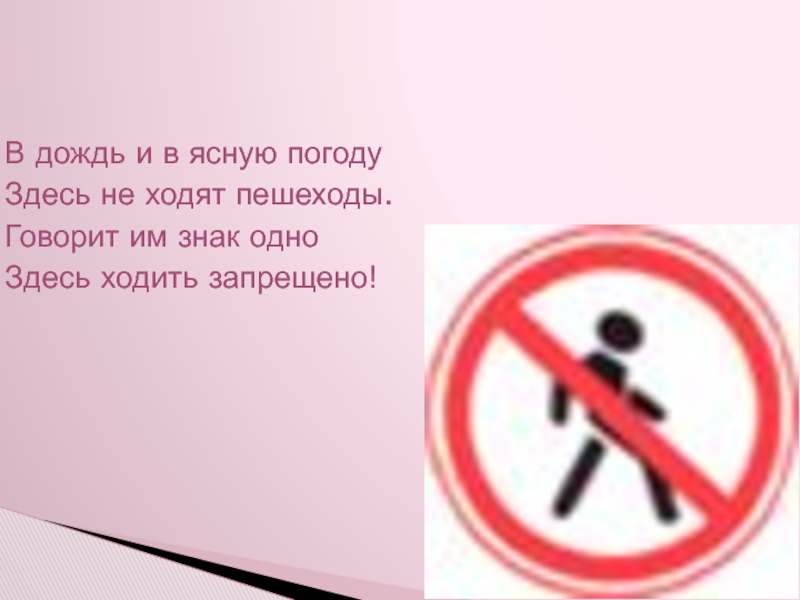 В дождь и в ясную погодуЗдесь не ходят пешеходы.Говорит им знак одноЗдесь ходить запрещено!