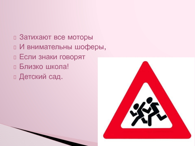 Затихают все моторыИ внимательны шоферы,Если знаки говорятБлизко школа! Детский сад.