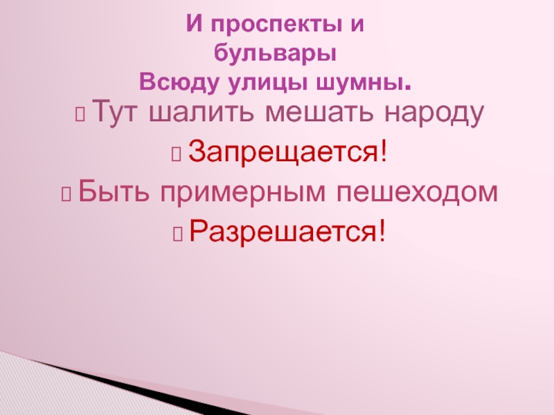 И проспекты и  бульвары  Всюду улицы шумны.Тут шалить мешать народуЗапрещается!Быть примерным пешеходомРазрешается!
