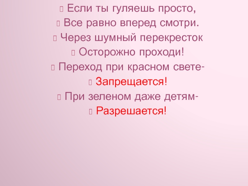 Если ты гуляешь просто,Все равно вперед смотри.Через шумный перекрестокОсторожно проходи!Переход при красном свете-Запрещается!При зеленом даже детям-Разрешается!