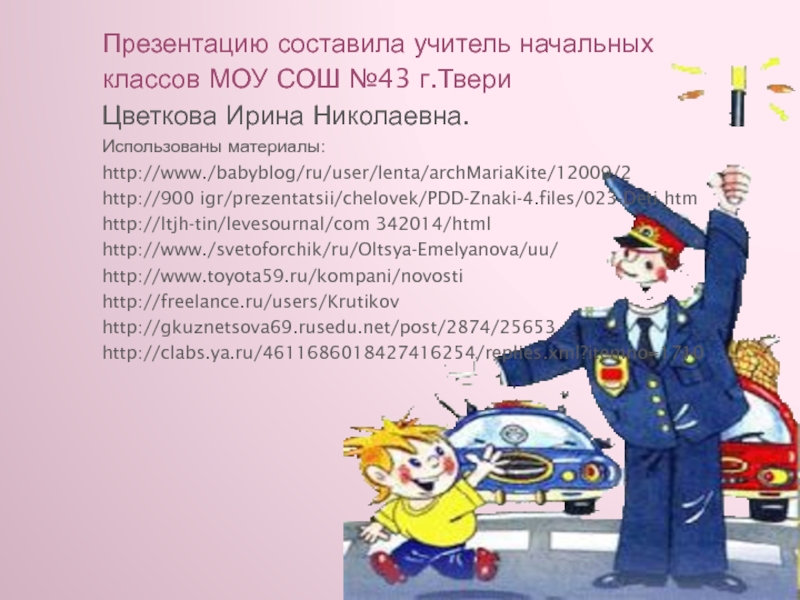 Презентацию составила учитель начальныхклассов МОУ СОШ №43 г.ТвериЦветкова Ирина Николаевна.Использованы материалы:http://www./babyblog/ru/user/lenta/archMariaKite/12009/2http://900 igr/prezentatsii/chelovek/PDD-Znaki-4.files/023-Deti htm http://ltjh-tin/levesournal/com 342014/htmlhttp://www./svetoforchik/ru/Oltsya-Emelyanova/uu/http://www.toyota59.ru/kompani/novostihttp://freelance.ru/users/Krutikovhttp://gkuznetsova69.rusedu.net/post/2874/25653http://clabs.ya.ru/4611686018427416254/replies.xml?itemno=1710