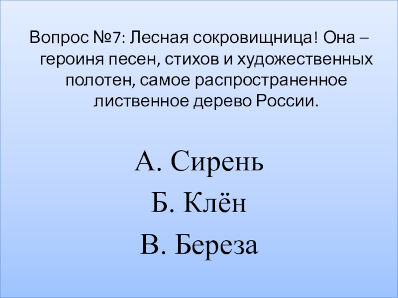 Вопрос №7: Лесная сокровищница! Она – героиня песен, стихов и художественных