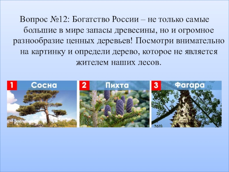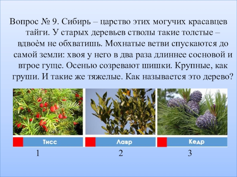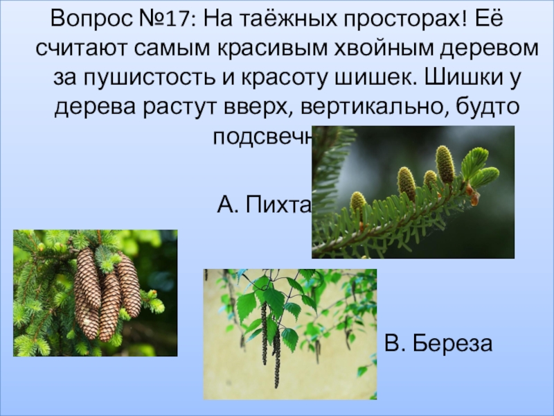 Слайд 19Вопрос №17: На таёжных просторах! Её считают самым красивым хвойным деревом