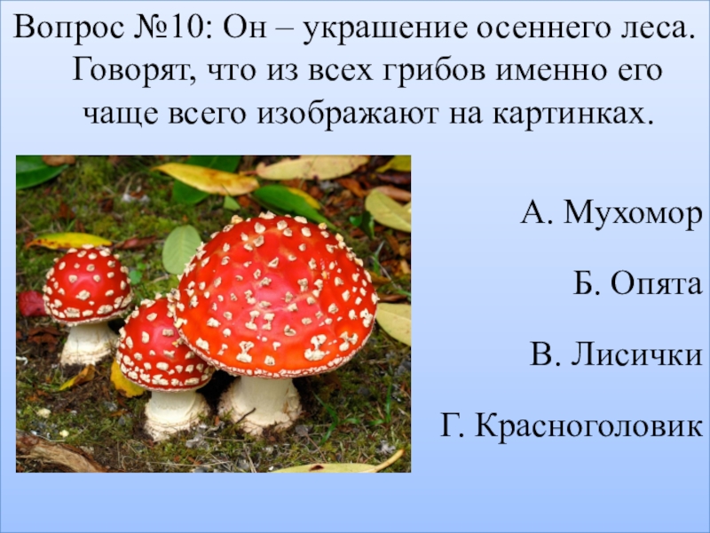 Слайд 12Вопрос №10: Он – украшение осеннего леса. Говорят, что из всех