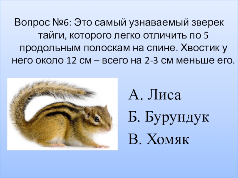 Вопрос №6: Это самый узнаваемый зверек тайги, которого легко отличить по