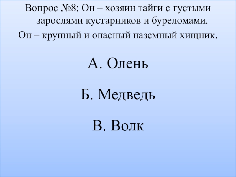 Слайд 10Вопрос №8: Он – хозяин тайги с густыми зарослями кустарников и