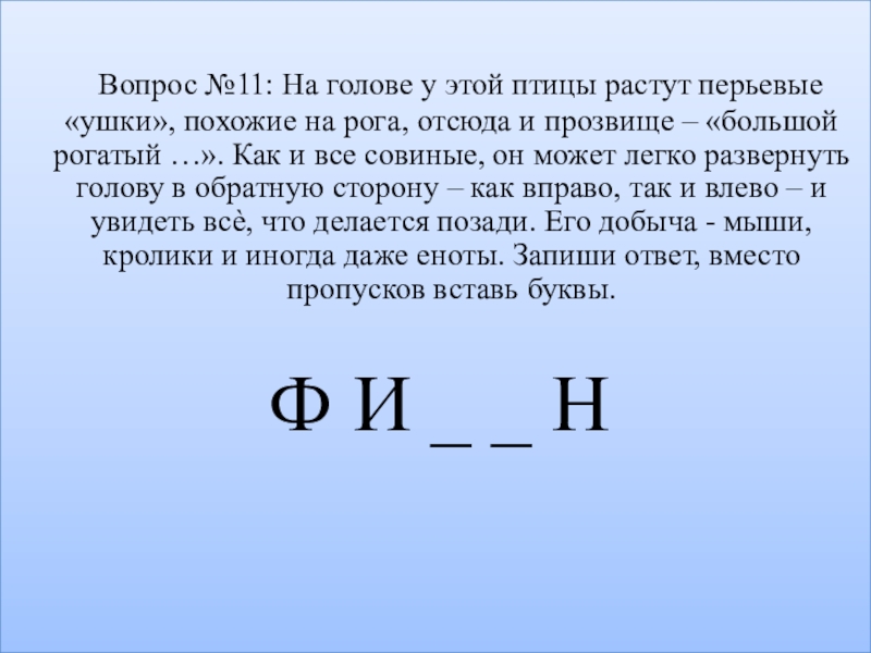 перьевые «ушки», похожие на рога, отсюда и прозвище – «большой рогатый …». Как и все совиные, он может легко развернуть голову в обратную сторону – как вправо, так и влево – и увидеть всѐ, что делается позади. Его добыча - мыши, кролики и иногда даже еноты. Запиши ответ, вместо пропусков вставь буквы.