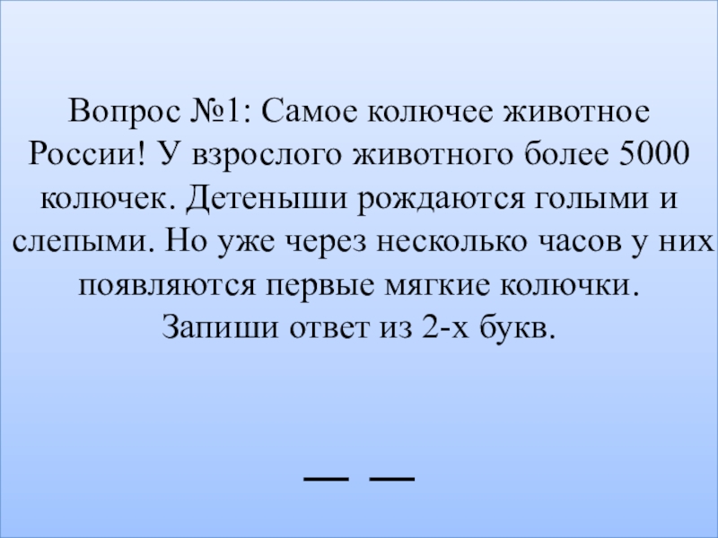 Слайд 3Вопрос №1: Самое колючее животное России! У взрослого животного более 5000