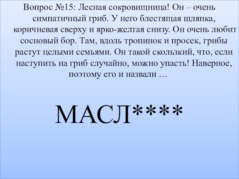 Слайд 17Вопрос №15: Лесная сокровищница! Он – очень симпатичный гриб. У него