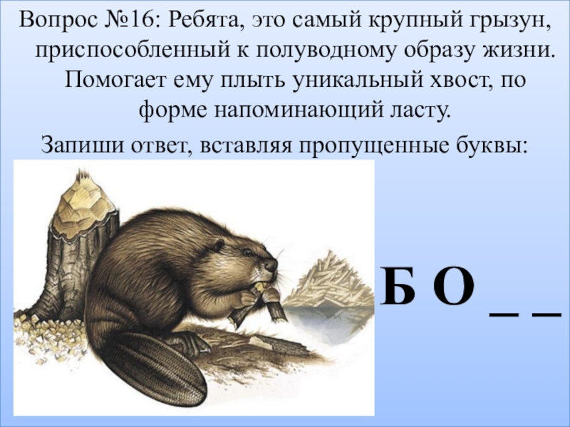 Слайд 18Вопрос №16: Ребята, это самый крупный грызун, приспособленный к полуводному образу