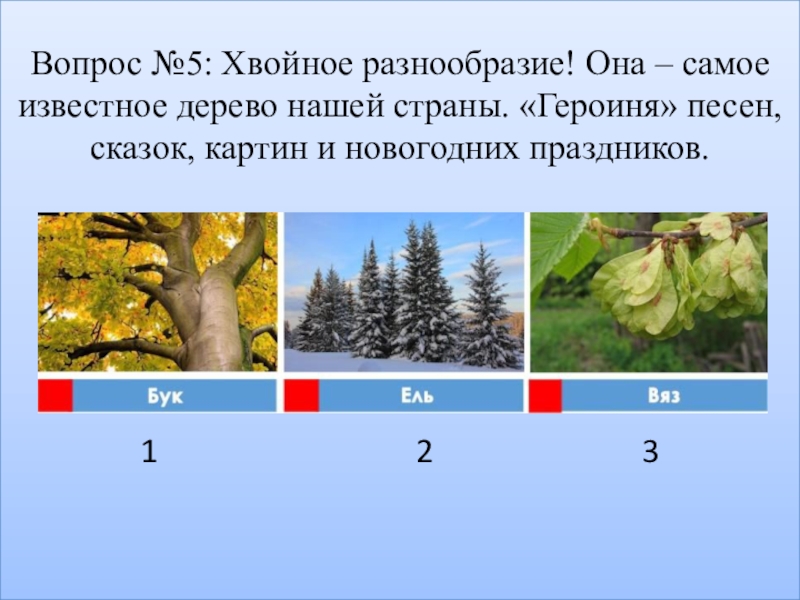 Слайд 7Вопрос №5: Хвойное разнообразие! Она – самое известное дерево нашей страны.