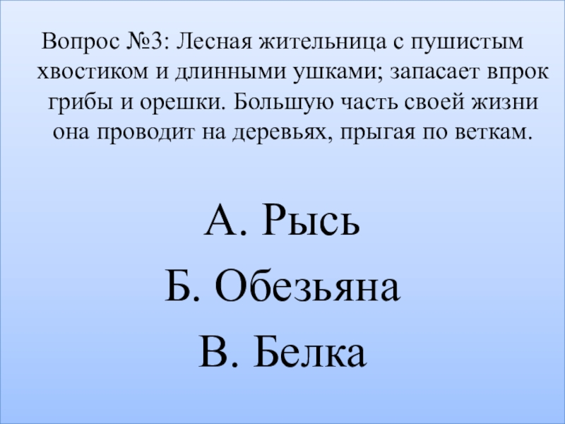 Вопрос №3: Лесная жительница с пушистым хвостиком и длинными ушками; запасает