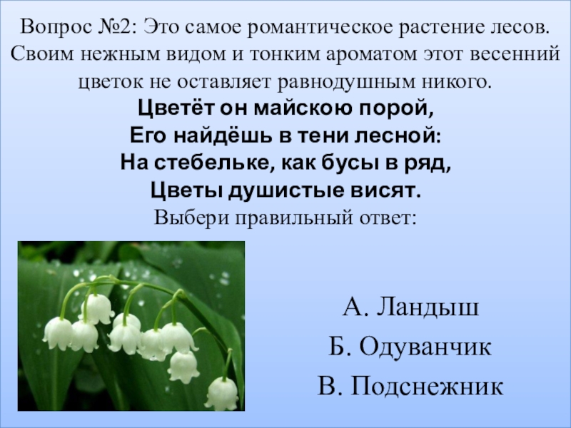 Вопрос №2: Это самое романтическое растение лесов. Своим нежным видом и