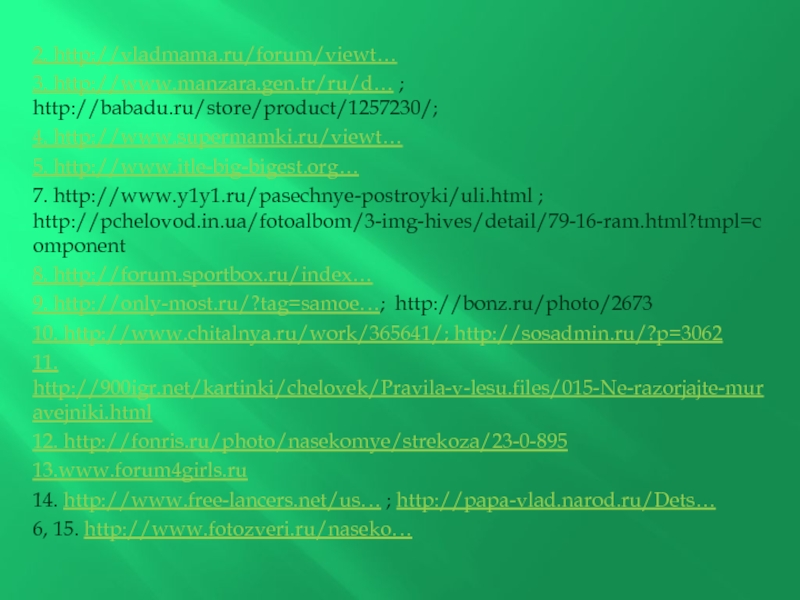 2. http://vladmama.ru/forum/viewt… 3. http://www.manzara.gen.tr/ru/d… ; http://babadu.ru/store/product/1257230/;4. http://www.supermamki.ru/viewt… 5. http://www.itle-big-bigest.org… 7. http://www.y1y1.ru/pasechnye-postroyki/uli.html ; http://pchelovod.in.ua/fotoalbom/3-img-hives/detail/79-16-ram.html?tmpl=component8. http://forum.sportbox.ru/index… 9. http://only-most.ru/?tag=samoe…;  http://bonz.ru/photo/267310. http://www.chitalnya.ru/work/365641/; http://sosadmin.ru/?p=306211. http://900igr.net/kartinki/chelovek/Pravila-v-lesu.files/015-Ne-razorjajte-muravejniki.html12. http://fonris.ru/photo/nasekomye/strekoza/23-0-89513.www.forum4girls.ru14. http://www.free-lancers.net/us… ;
