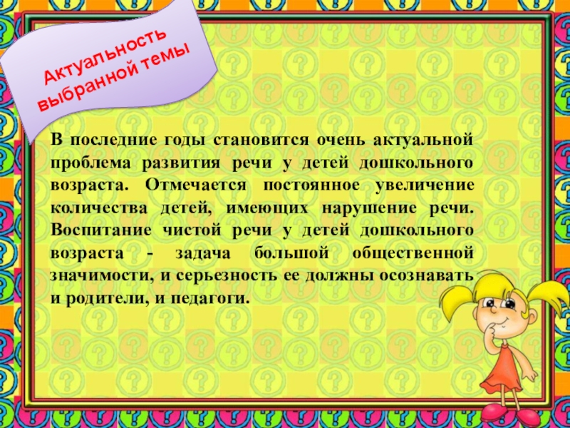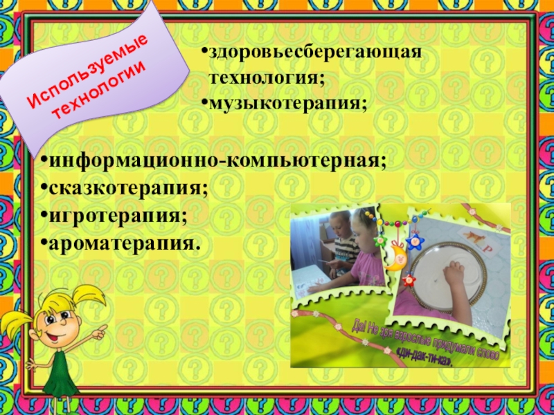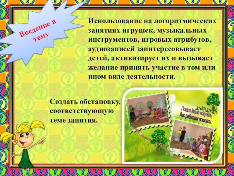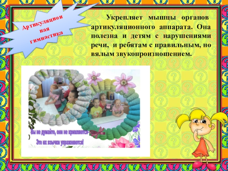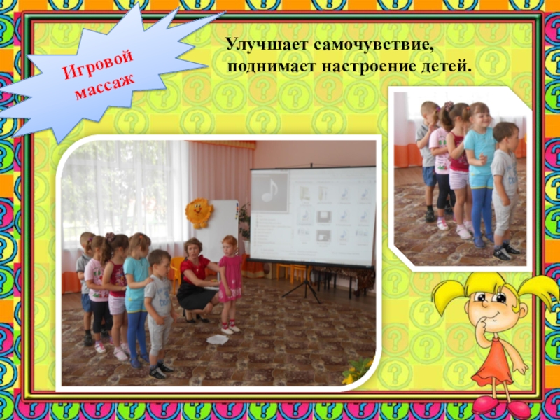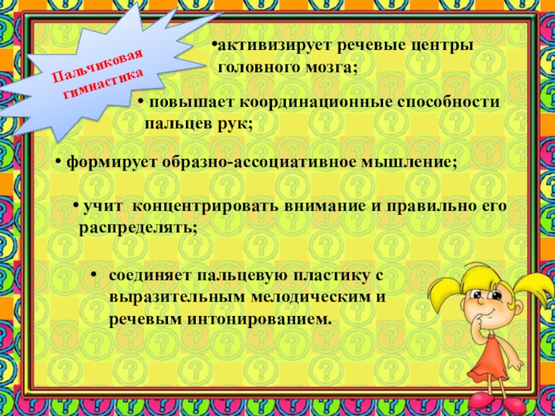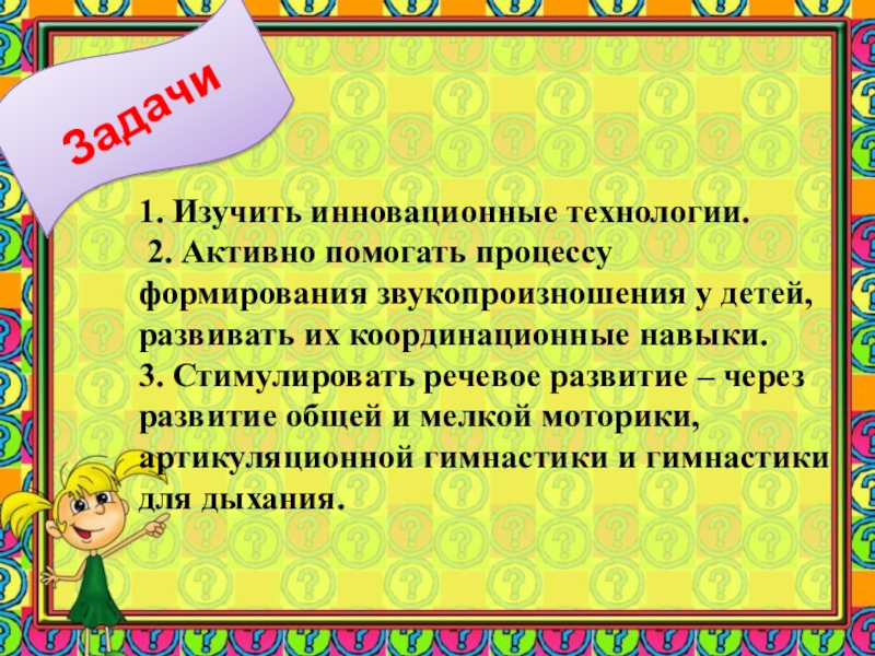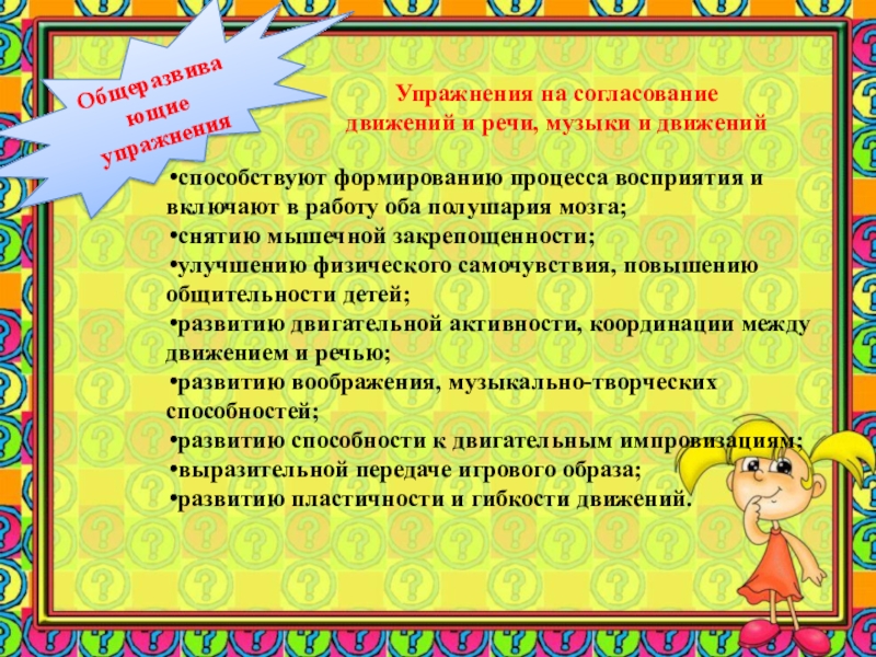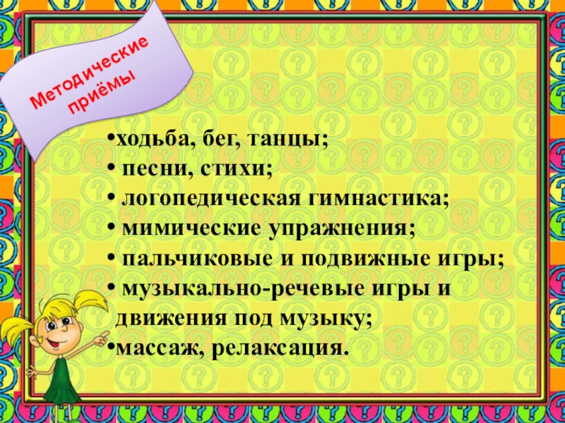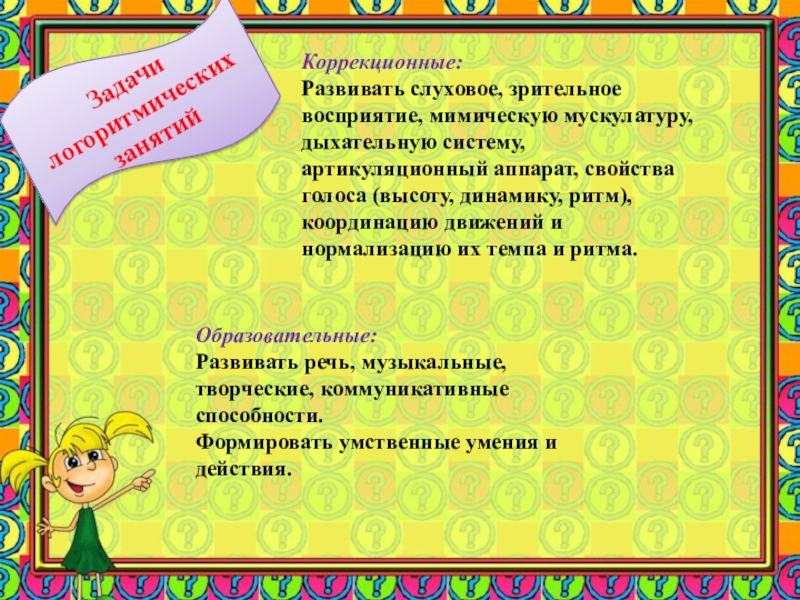 Развивать слуховое, зрительное восприятие, мимическую мускулатуру, дыхательную систему, артикуляционный аппарат, свойства голоса (высоту, динамику, ритм), координацию движений и нормализацию их темпа и ритма.