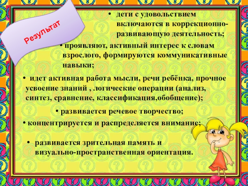 идет активная работа мысли, речи ребёнка, прочное усвоение знаний , логические операции (анализ, синтез, сравнение, классификация,обобщение);