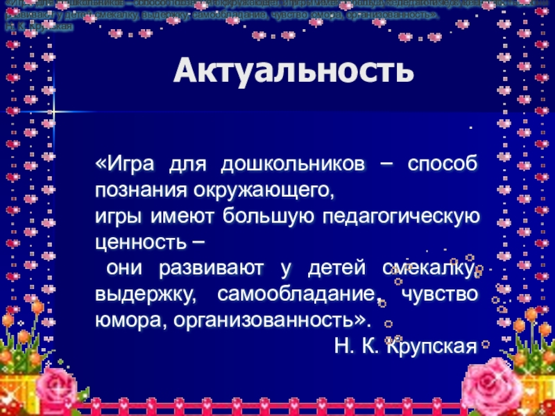 «Игра для дошкольников – способ познания окружающего, игры имеют большую педагогическую ценность – они развивают у детей смекалку, выдержку, самообладание, чувство юмора, организованность».